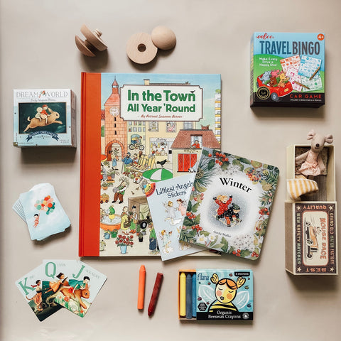 When we take a long trip, I pack a bag for each child filled with activities I know will keep their interest for good chunks of time. My children enjoy sketchbooks, crayons and colored pencils, stickers and books without words. They are especially fond of seek and find books; we adore this book, In the Town, All Year 'Round. It follows townsfolk through each season and is just very fun. A new cuddly friend, or old much-loved one, has proven very helpful for travel as my children will often sit in their seats and chat with it. We have also found Doodle Pros, Wiki-stix and window cling stickers to be fun travel items that keep our children's interest for longer periods of time.