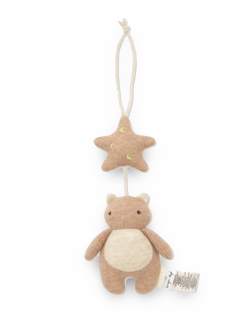 Soft activity toy made from 80 percent lambswool and 20 percent nylon. Designed with a bell inside, that makes a gentle ringing sound when the baby plays with the toy. Features a practical knitted hanger.
