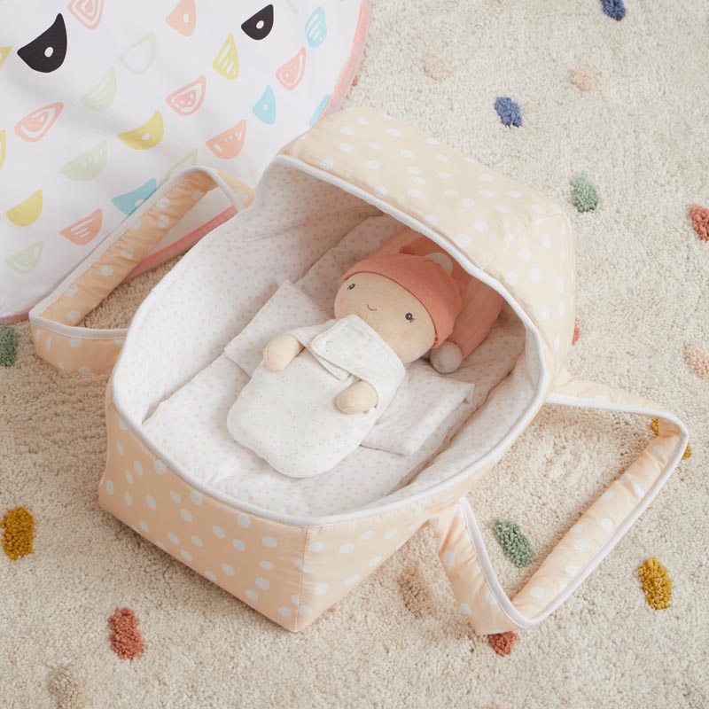 OH BABY! What a doll!  Your sweet baby will love our sweet baby doll.  Our soft cuddly cotton cotton doll comes complete with knit cap, diaper and swaddle blanket.  Crying not included.