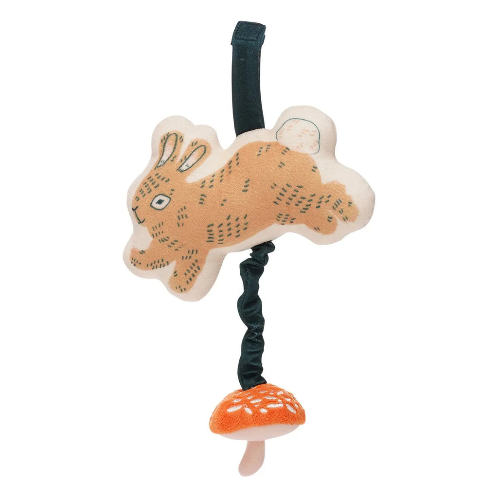 A delightful bunny pull-musical for littles on-the-go. This bunny-themed travel toy features printed graphics, a playful chime and soft fabric textures. Pull down on the mushroom to hear Brahms Lullaby. Adjustable fabric loop allows for attachment to most carriers, strollers, cribs and more. Encourages motor development, cognitive thinking and cause and effect learning.