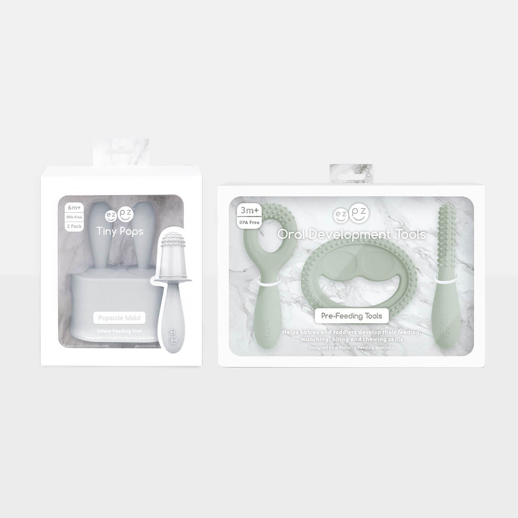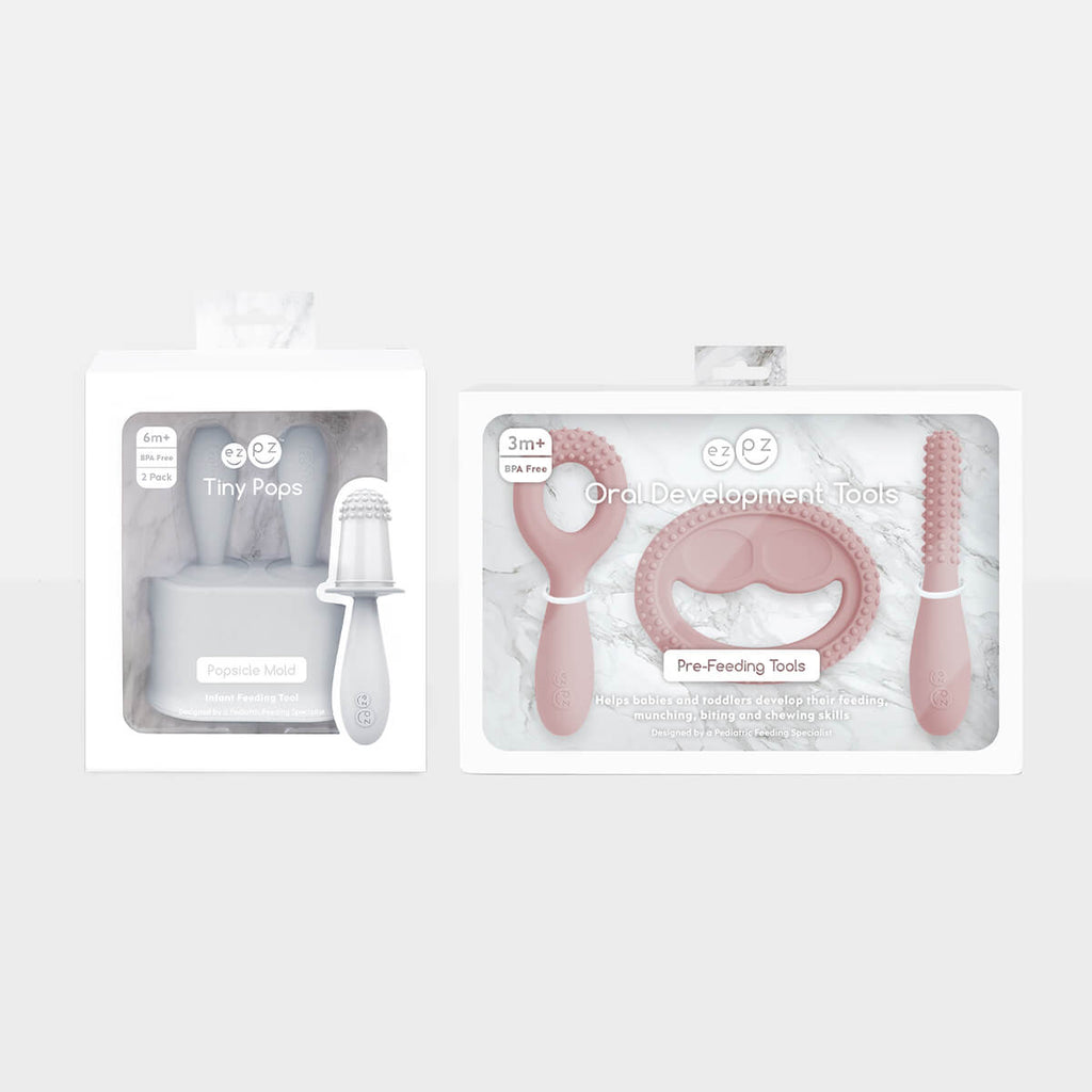 Snag our top-selling pre-feeding tools in one tidy purchase! This set includes a 3-pack of ezpz Oral Development Tools (sensorimotor devices designed to help babies and toddlers practice their feeding, munching, biting and chewing skills) and Tiny Pops (a popsicle mold made for infants).