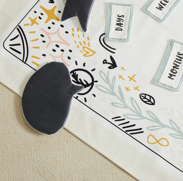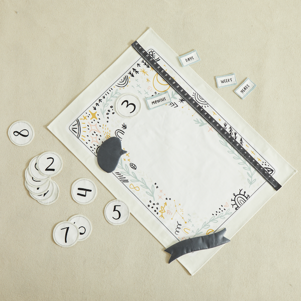 Every day marks a milestone with our Baby Milestone Mat.  Cotton canvas boasts earthy design, and includes chalk cloth word bubble, chalk cloth banner, canvas numbers 1-12, canvas months x 12, and a measuring tape.  Just add baby!