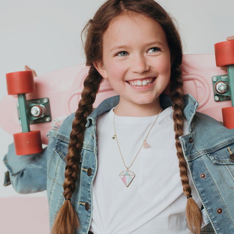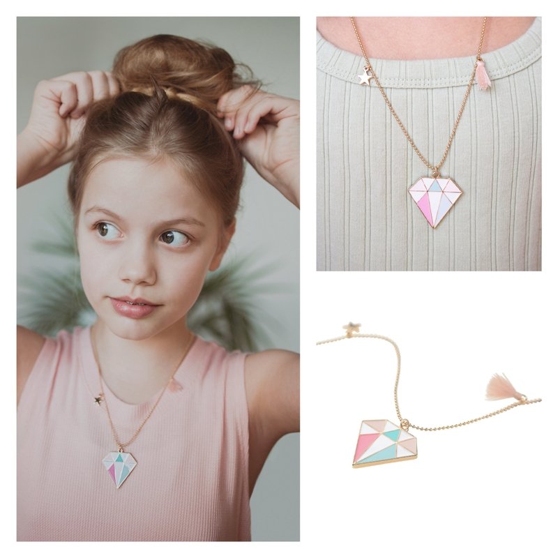 Rediscover beauty with this diamond shaped charm necklace that has pastel colored inserts suspended from an adjustable gold toned ball chain. The enameled gem pendant has a delightful gold star charm dangle plus a fluffy soft peach hued tassel that coordinates with the gem charm. So fun to wear, they won’t want to take it off!