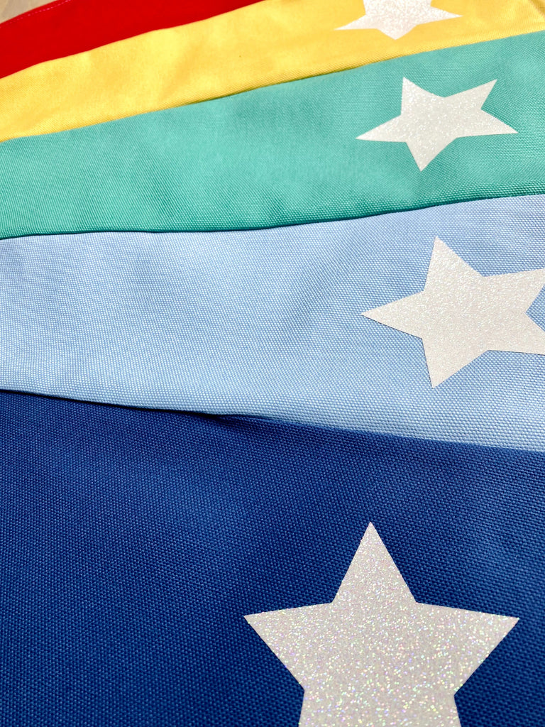 Let your kids embrace their inner Superhero! Our rainbow Superhero Cape will satisfy all of their dreams. Made of 100% cotton canvas, it is durable and sturdy. Glitter stars add a bit of whimsy!