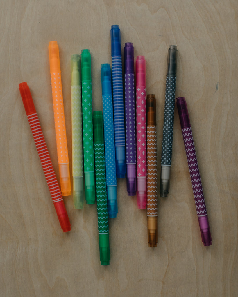 Just flip these erasable markers over and erase it if you go outside the lines.  Create unique designs by using the eraser end to add detail or texture to your coloring.  The chiseled tips allow for either broad or narrow strokes. With twelve colors included, it’s all the variety you need.