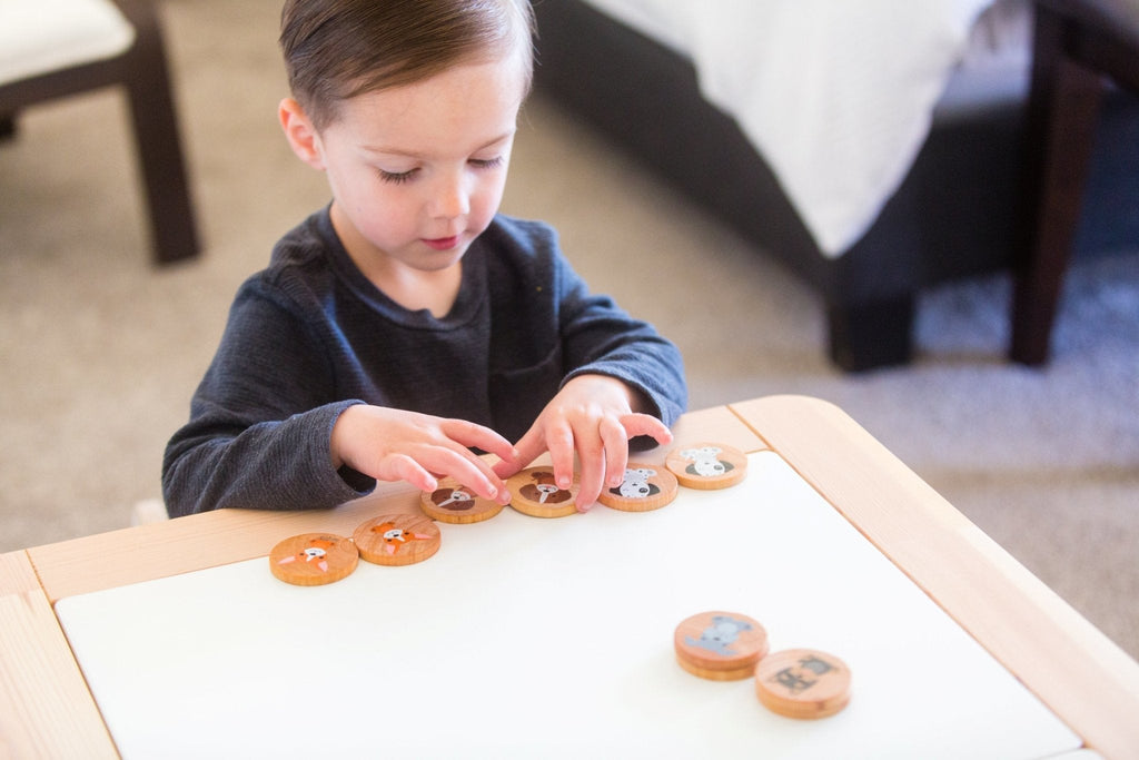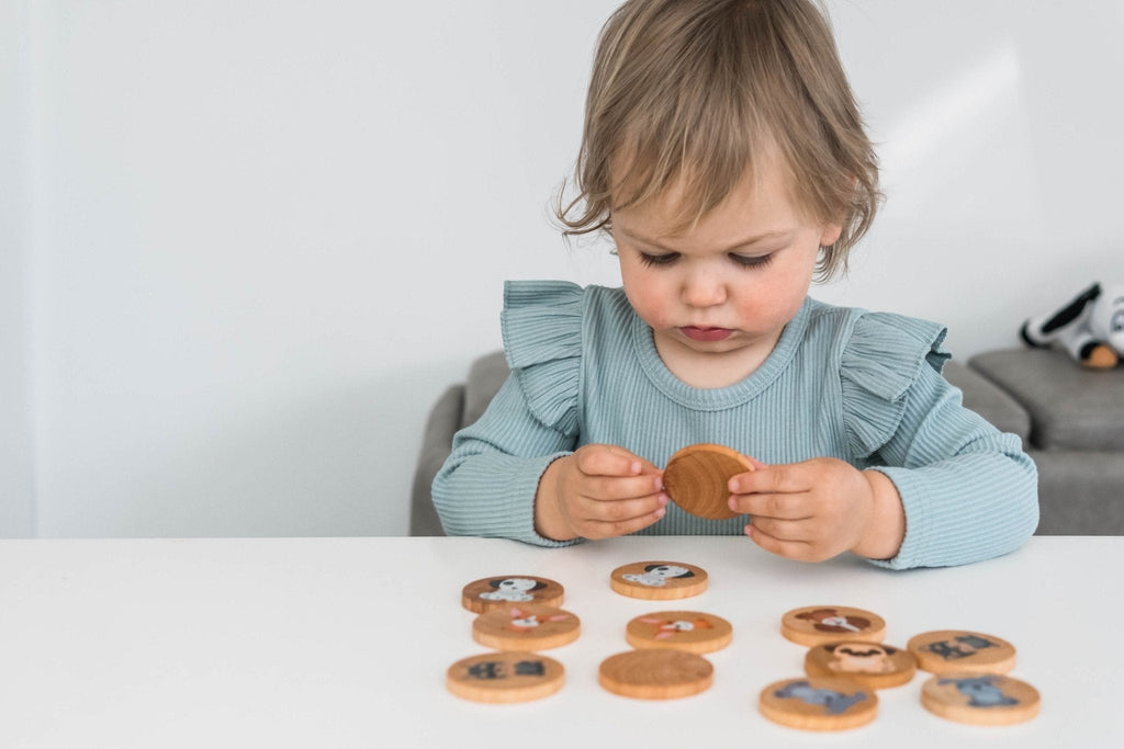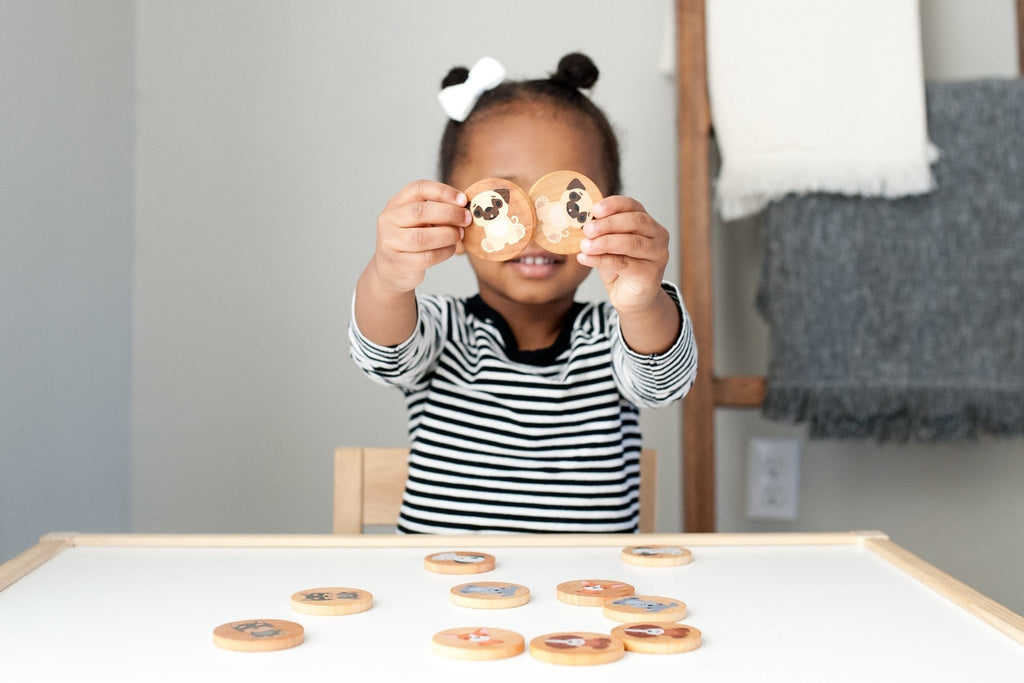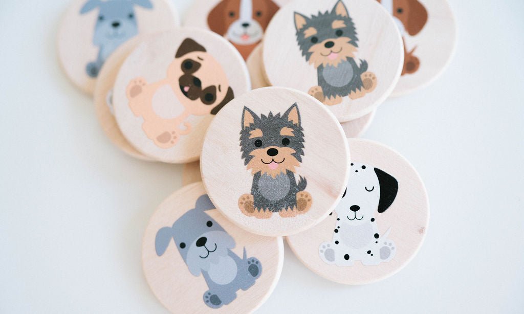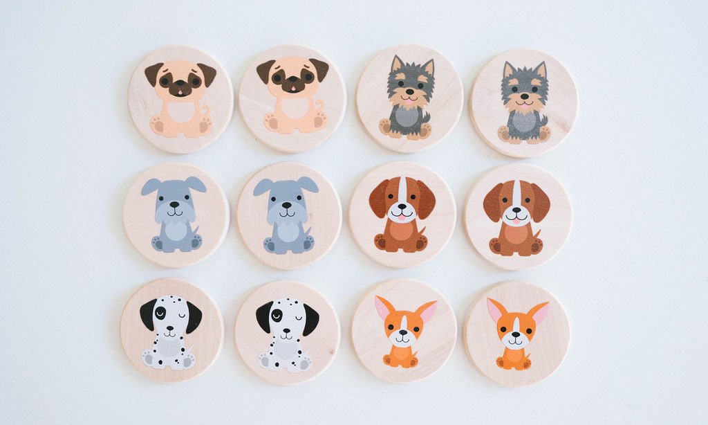 Woof Woof!! A man's best friend is now in a matching game! This memory matching set consists of 6 adorable dog designs on 12 wooden tiles. It can be enjoyed solo or with the entire family - teaching kids to take turns and share with others.  Our wooden matching tiles will also promote short term memory skills.