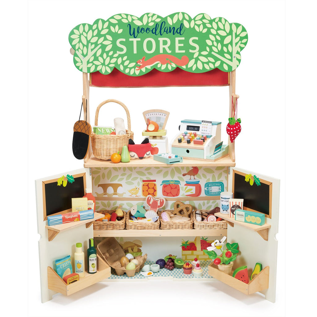 A large play shop that offers group play on both sides. On one side, it is a Woodland Stores play shop - it has 2 doors which open up into a shop and 2 blackboard areas on which to scribble. There is a curtain which can be lowered to announce the shop is shut. On the reverse of the structure, the shop turns into a Woodland Theater, and we have included 2 sweet printed glove puppets. There is an acorn blackboard to chalk a time and date, and the red curtain can be raised or lowered for the performance.